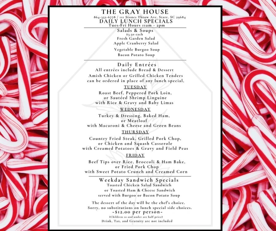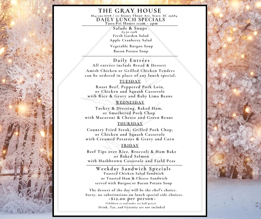 Also open for dinner on Fridays & Saturdays & Sunday Southern Lunch (by reservation) Call 864-352-6778!
